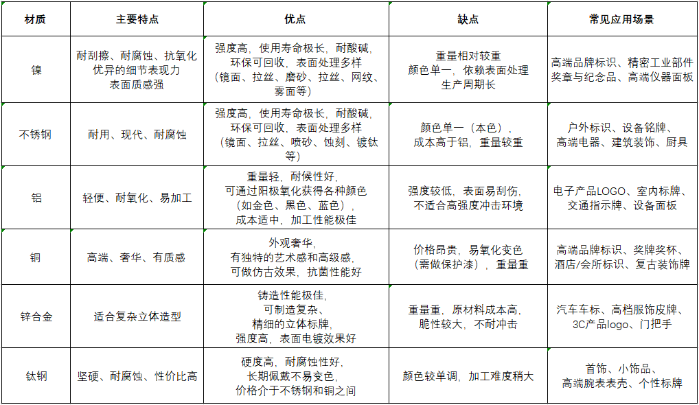 主流金屬標(biāo)牌材質(zhì)對(duì)比一覽表